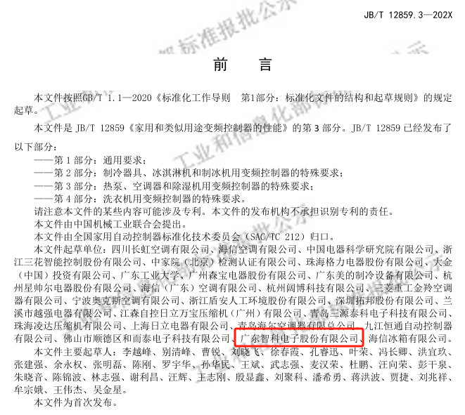 近日,智科股份在行业标准领域再传佳音,企业参与的行业标准JB/T 12859.3-2024《家用和类似用途变频控制器的性能 第3部分:热泵、空调器和除湿机用变频控制器的特殊要求》已经公示。这一里程碑式的成就,不仅彰显了智科股份在变频控制器技术领域的领先地位,更体现了其对行业规范与发展所做出的巨大贡献。